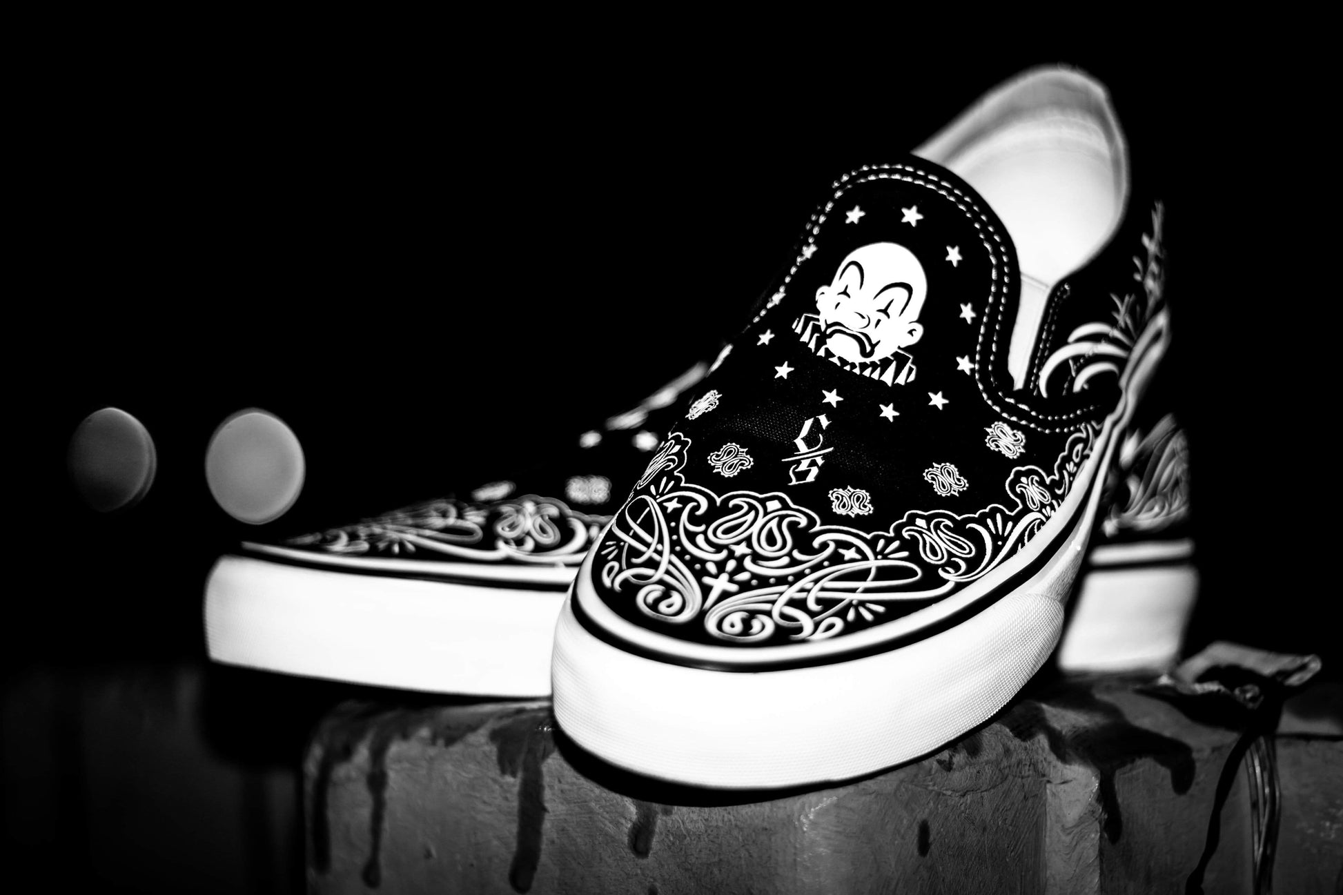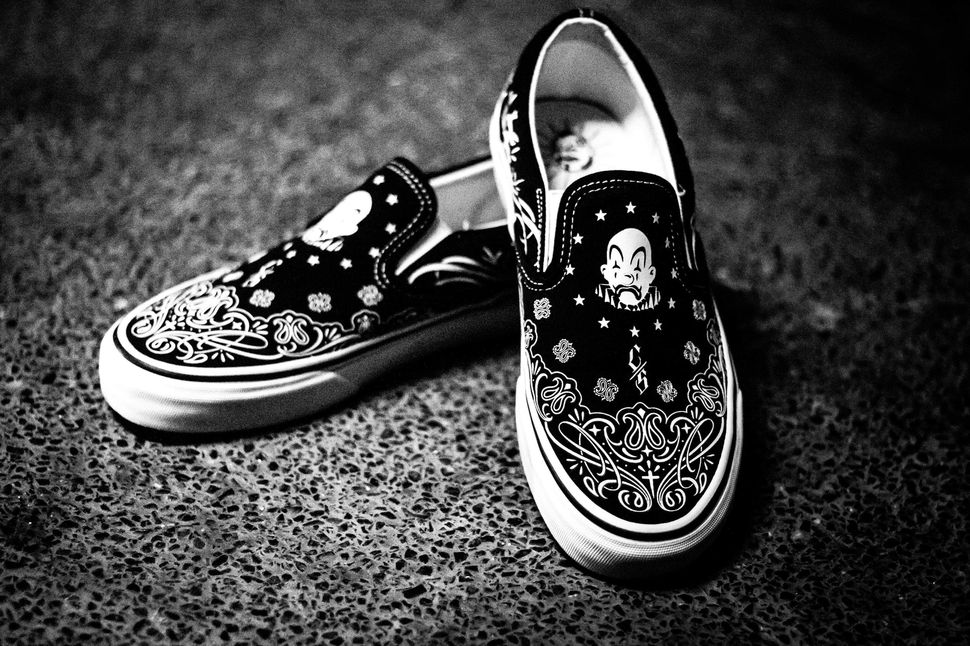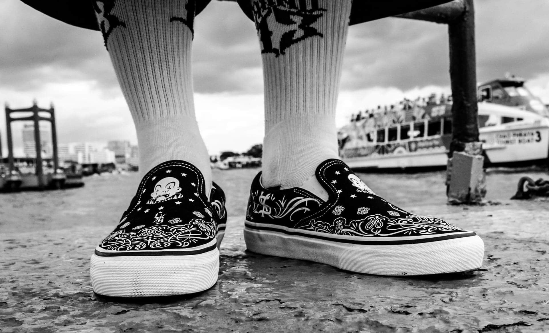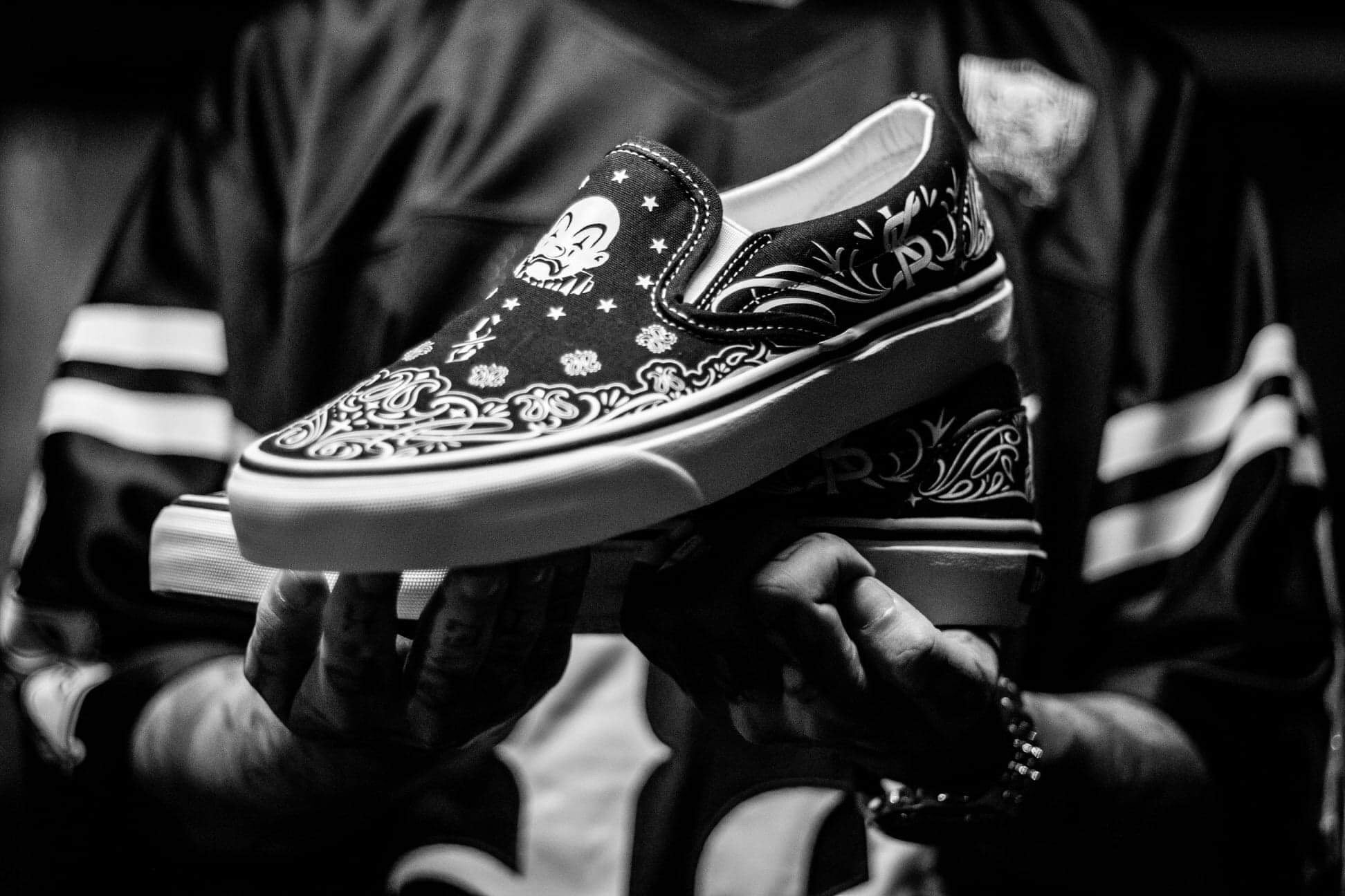 These Bandana Slip-Ons fuse iconic tattoo-inspired patterns, bold monochrome contrast, and timeless lowrider vibes.