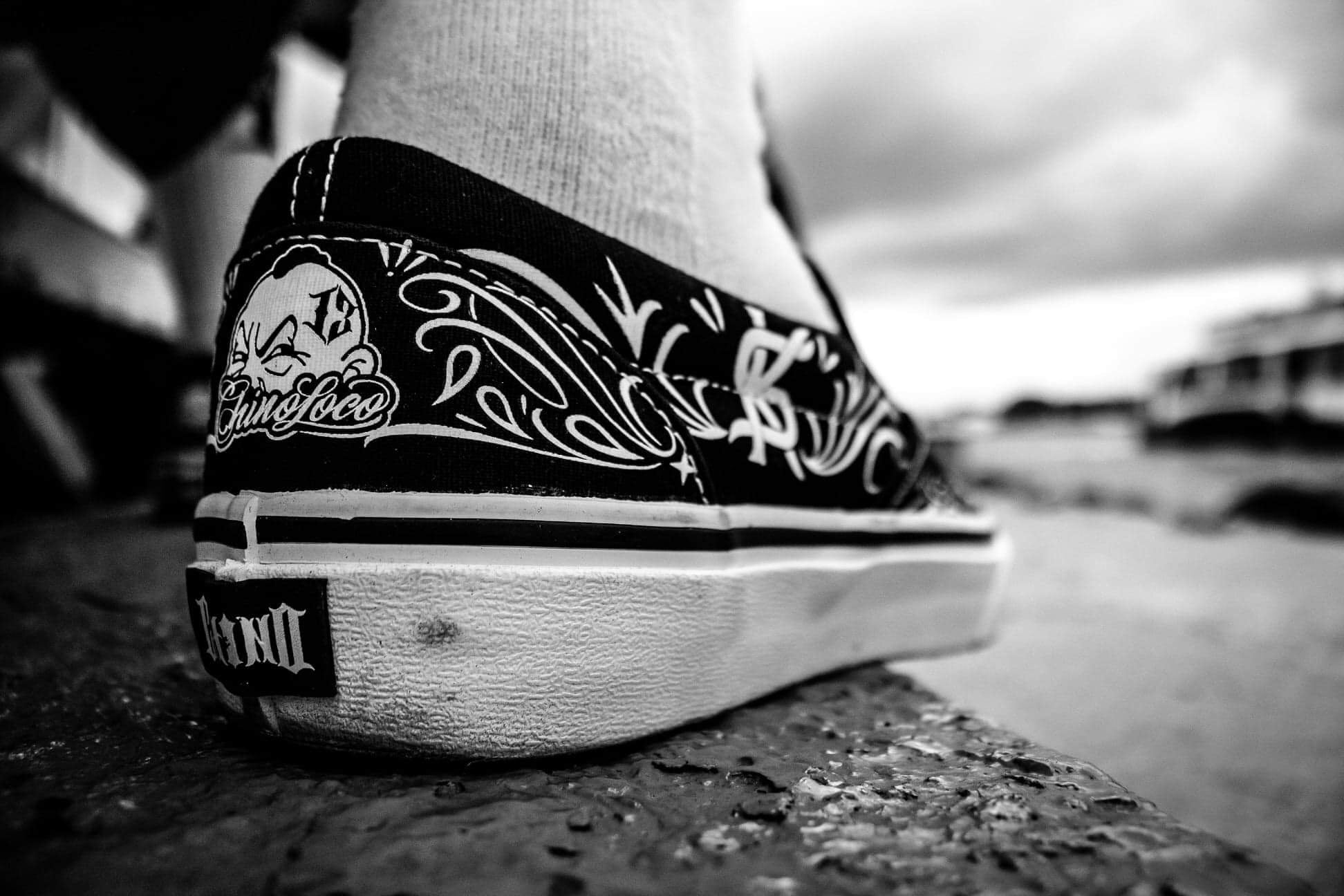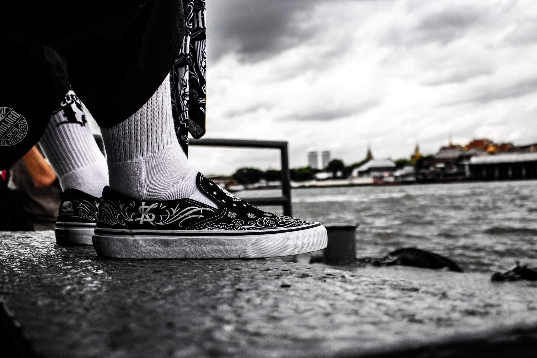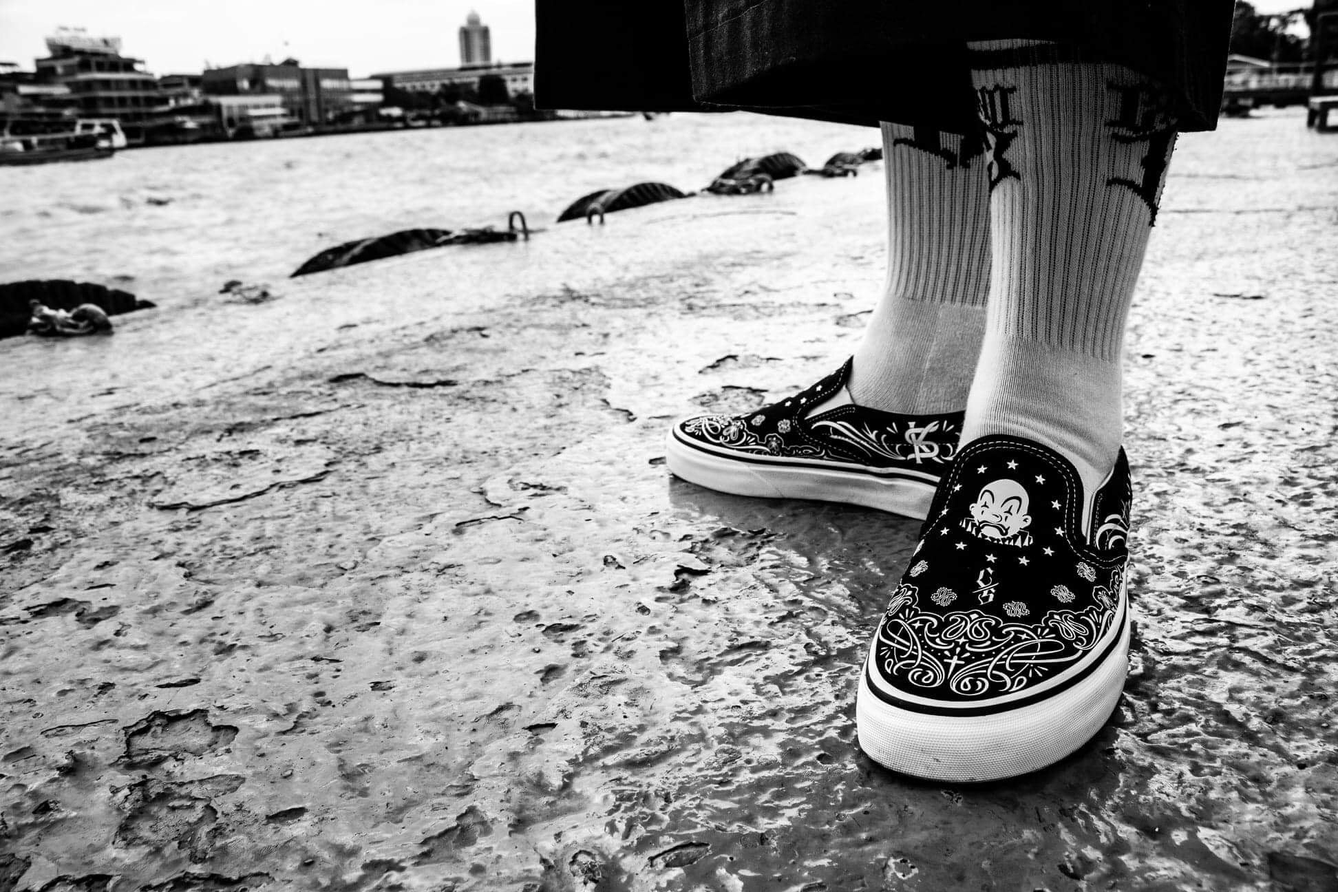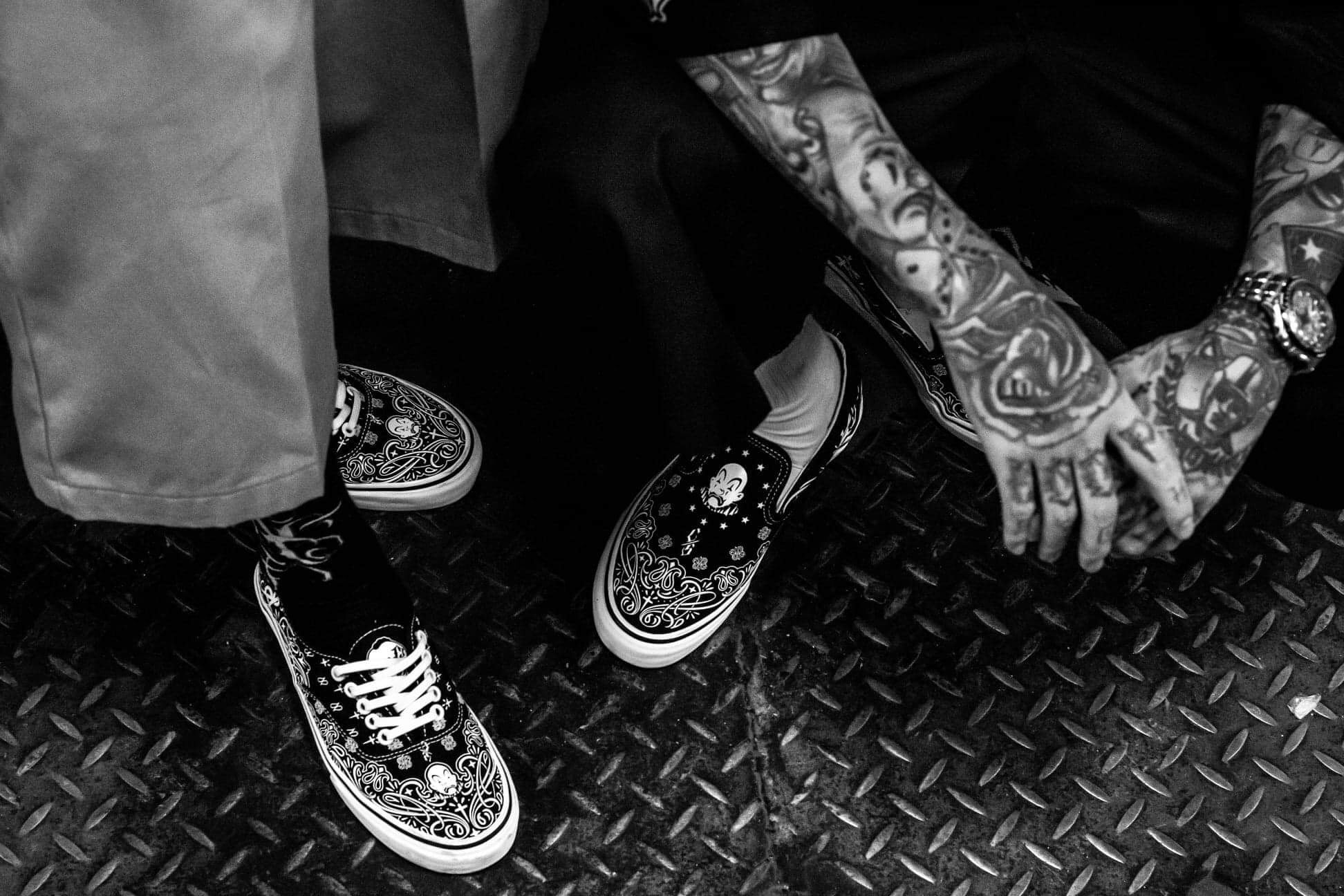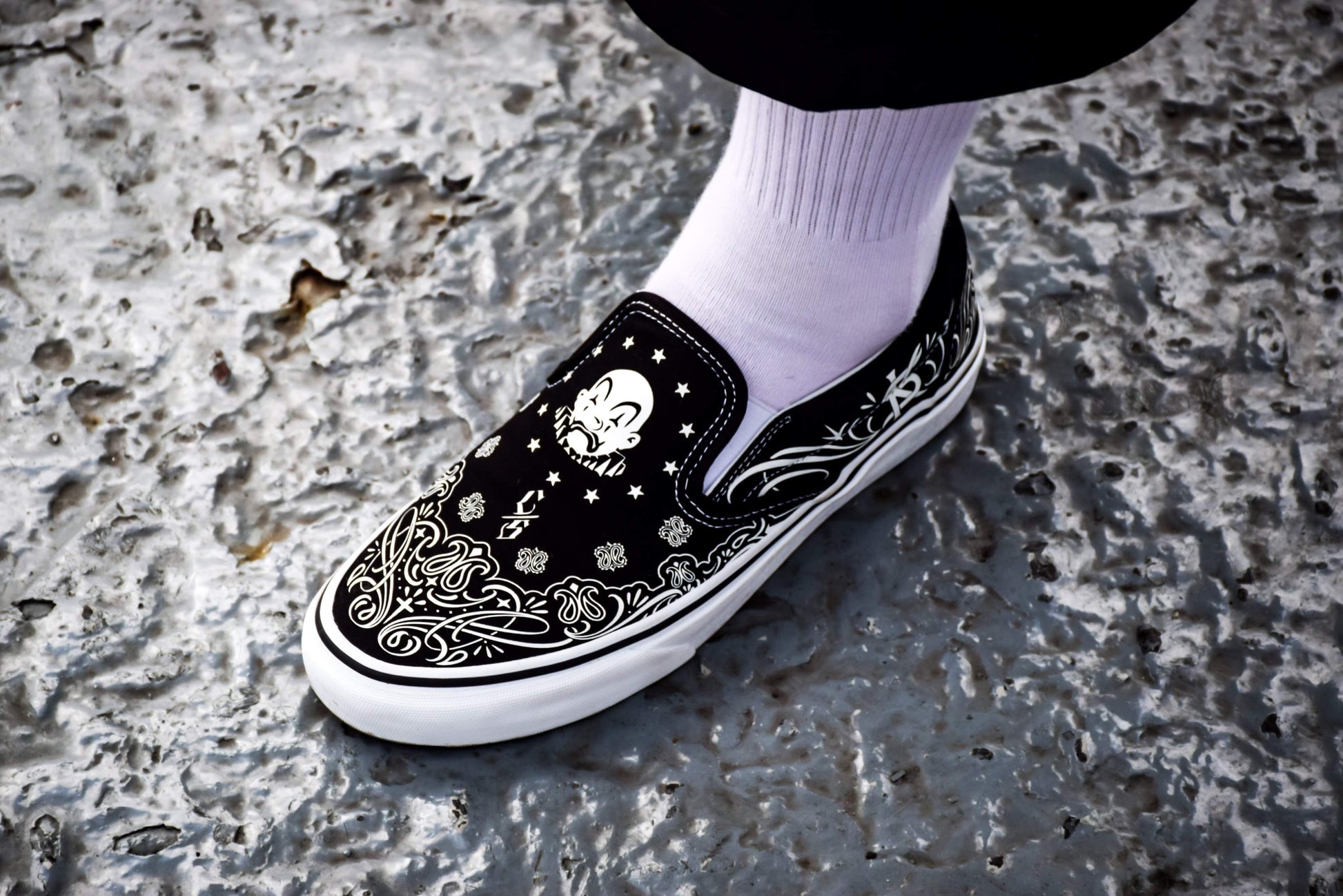 These Bandana Slip-Ons fuse iconic tattoo-inspired patterns, bold monochrome contrast, and timeless lowrider vibes.