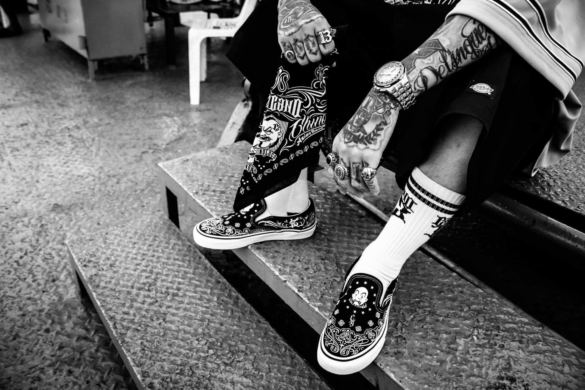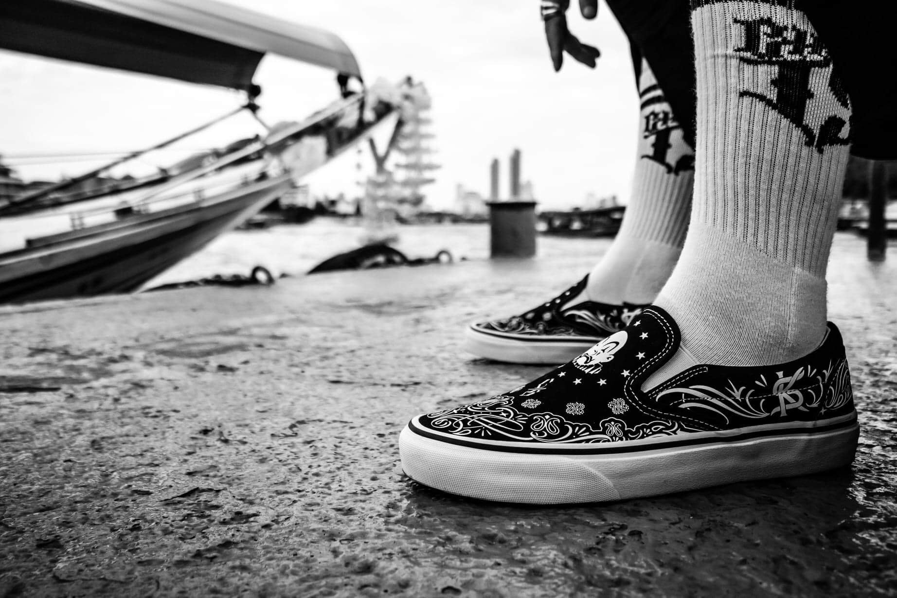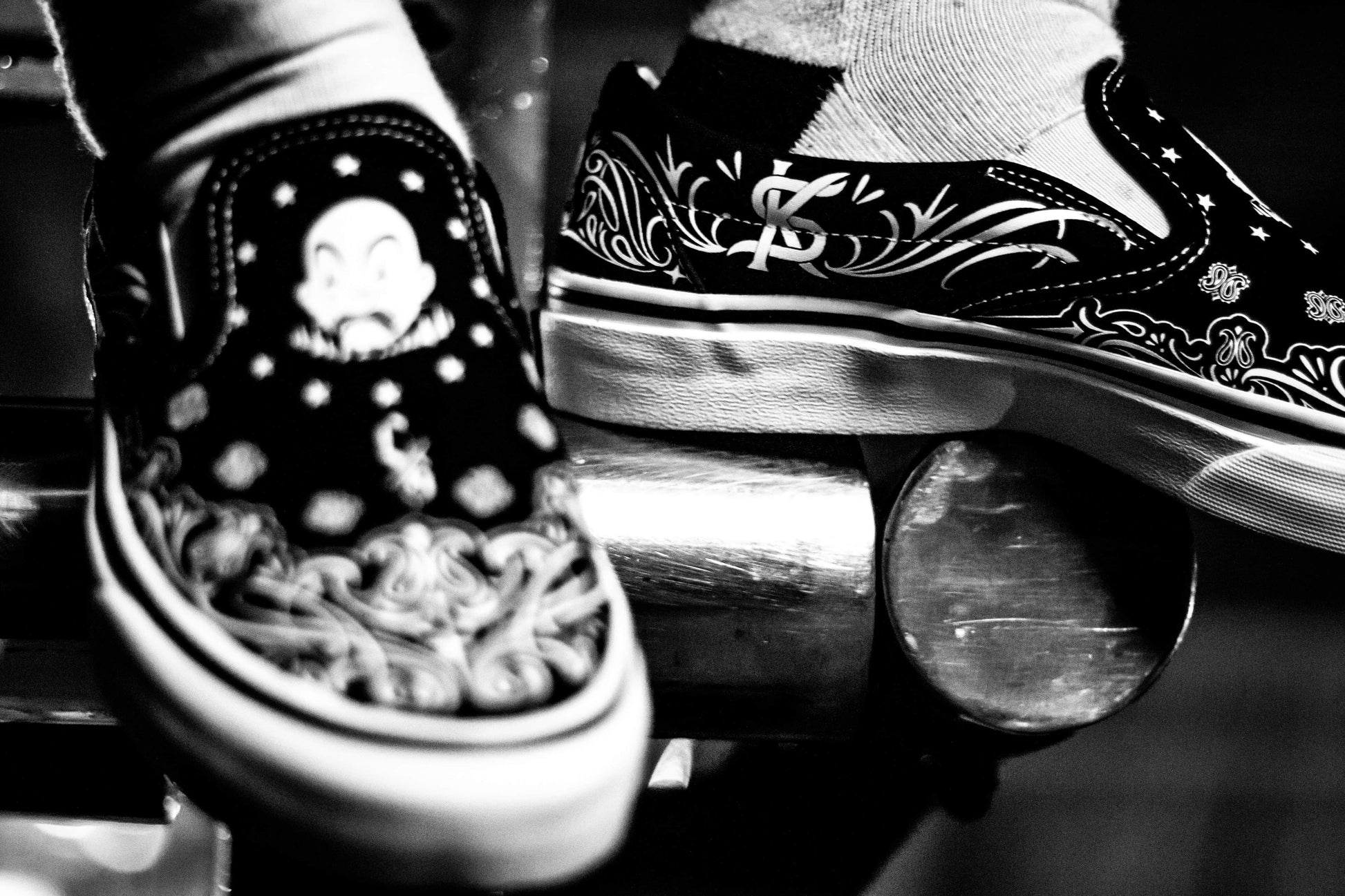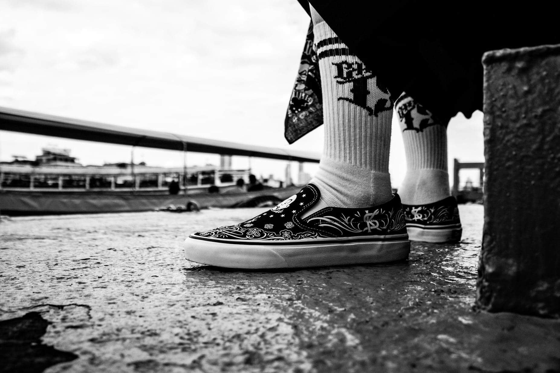 These Bandana Slip-Ons fuse iconic tattoo-inspired patterns, bold monochrome contrast, and timeless lowrider vibes.